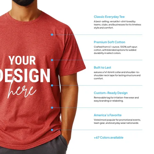 | Colors | Aquatic Blue, Ash, Athletic Heather, Athletic Maroon, Black Heather, Brown, Candy Pink, Cardinal Colonial Blue, Charcoal, Coyote Brown, Dark Green, Dark Heather Grey, Desert Sand, Gold, Graphite Heather, Heather Navy, Heather Purple, Heather Red, Heather Royal, Jade Green, Kelly Green, Light Blue, Lime, Medium Grey, Navy, Neon Blue, Neon Pink, Oatmeal Heather, Olive Drab Green, Orange, Purple, Red, Royal, Safety Green, Safety Orange, Sangria, Sapphire, Silver, Steel Blue, True Navy, True Royal, Vintage Jade Green, Vintage Kelly, Vintage Red, Vintage Royal, White, Woodland Brown, Yellow |